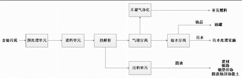 工藝流程:采用熱解技術(shù)外部加熱形式,將物料加熱至300~500℃,含油污泥中的水、油品等在密閉無氧空間中蒸發(fā)析出,經(jīng)過冷凝系統(tǒng)后使揮發(fā)物凝結(jié),在通過油水分離裝置分離出油品,油品經(jīng)過加工后出售。產(chǎn)出的不凝氣可作為補充燃料使用。